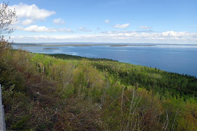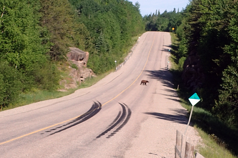 We had heavy rain overnight as forecast and were up early with the bugs. No night time visitors at all. The track back to the highway was quite muddy. It was an overcast day and the road undulated. After a few days away from the Lake we caught a glimpse of it about halfway. We had picked up some extra supplies at White River yesterday which proved fortunate as there were no stores en route today. We did see a campsite advertised just before Marathon; the billboard said it was 23 km away and had meals, etc. but we assumed it was off our route. We had not gone into Marathon as it is a few kilometres off Highway 17 but I suppose many tourists do.