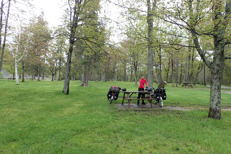The highway was wet, busy with trucks and fast! We made great time as result. You do need to concentrate more on a highway but the shoulder varied from very narrow to very wide and there was often an additional vehicle lane so we had a bit of room. The oncoming trucks were full logging trucks and most of those passing us were empty. We stopped by a waterfall picnic area for a rest and then again just before our campsite at Blind River for a meal. We had water views of surrounding lakes. It was raining quite heavily by the time we arrived but we made good time.