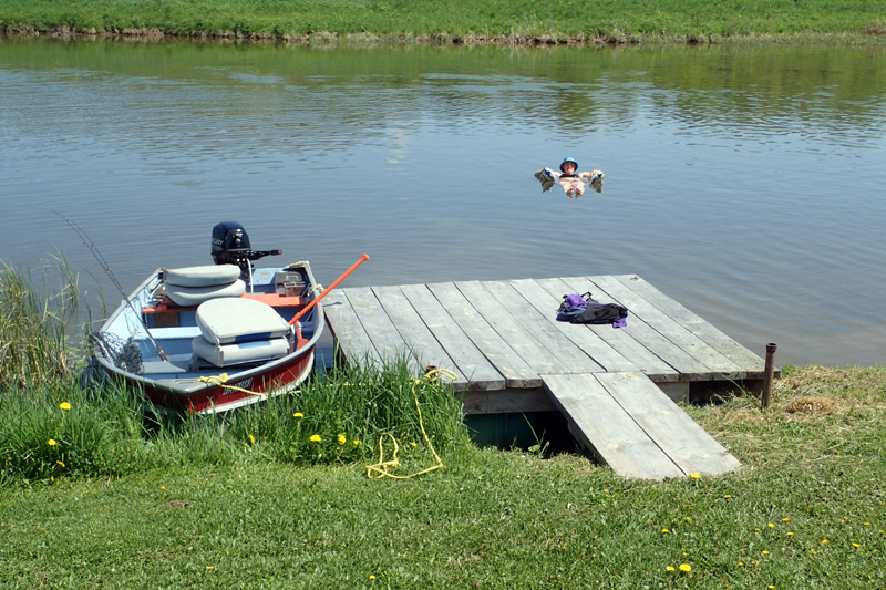 We had a few swims as the day was warm and were warned about the "snapping turtles" in the river. A bit later two little kids came over to show us a baby turtle which they had caught in a bucket. The bugs were very kind to us all day as well. In the evening we saw something swimming in the river. At first we thought it was a dog, but then thought it an otter. The locals told us it was a beaver; our first sighting of the trip.