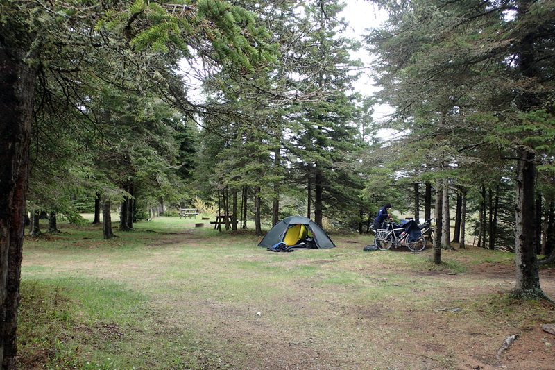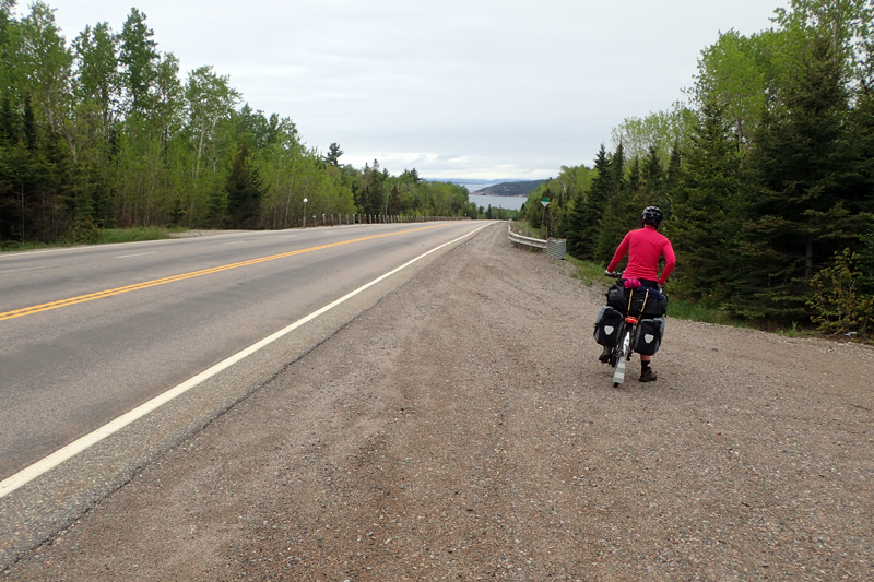 After 60 km we reached Terrace Bay, just in time for lunch which we ate at Subway. Also we did some general stocking up of supplies. Terrace Bay is a pretty place. Not long after Terrace Bay we passed through Schreiber which was not so pretty and then it was a few kilometres further to the provincial park. We did have three stop/goes due to road construction but the weather was great and all you could do was smile.