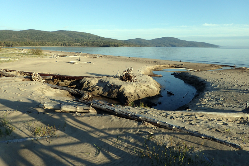 We did as she said and had a swim in the lake (which has an average surface temperature of only 4.4 degC!) and are now camping on the beach. It is very beautiful. We had a meal from our stash and spent some time outside as there are no bugs! It turned cool though and as we got into the tent a family of geese and goslings came up out of the lake to find their place for the night.