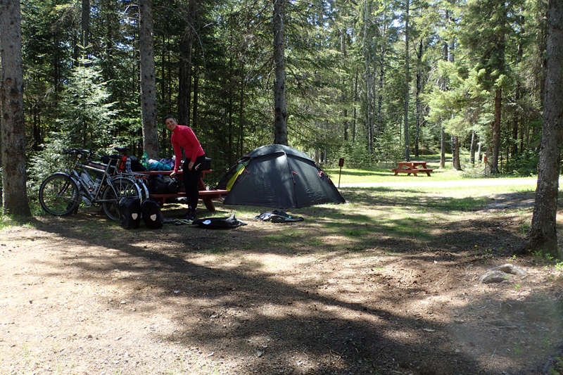 After this I felt a little low in energy and had a roadside snack. As we pulled into the suburbs Mike stopped to pick up an Amazon order from the post office (new Keen sandals). Then it was just 3 km UP-hill to the campsite. We met another tourist coming down the hill who had started in Calgary on 12 April (brrrrr) and was headed to Prince Edward Island (Nova Scotia). The campsite is big with a large undercover area which is great and we have a nice tent site. We will have a rest day here tomorrow. The laundry is already done and hanging up to dry.