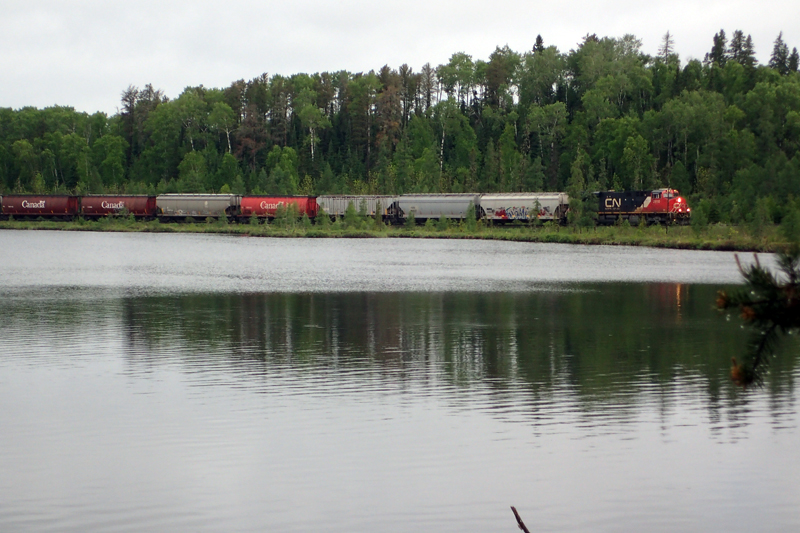 We had a very peaceful night until about midnight when a storm moved in and it rained quite heavily for the rest of the night. We had strung up some extra food that did not fit in the bear containers as well as our garbage in a tree a little way from the tent and then could not sleep worrying about our bread becoming waterlogged. The worst fate imaginable for cycle tourists, food being ruined! The good thing was that by the time we got up to have breakfast and pack, the rain was almost over. We saw two goods trains on the railway just on the other side of the lake.