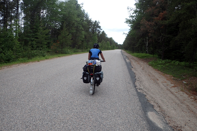 Just before leaving we chatted again to the other tourist. His name is Xavier and he is headed for Vancouver. He plans to do this in 2 months. It has long been a dream of his to do this trip and this is his first long distance trip. Once again as always, we are filled with admiration for the solo tourist! He had not planned the trip solo but his touring buddy dropped out so he decided to do it anyway. Good on him! He was planned to go all the way to Sault Ste. Marie today which is a hefty 130 km.