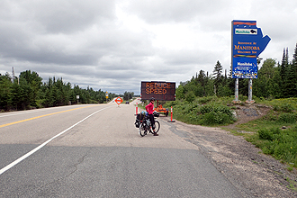 We had first seen the roadside distance markers on Highway 17 at Sault Ste Marie. They count down to the end of the highway where it crosses into Manitoba and becomes something else (PTH 1 I think). The 1296 km (to go) marker is always the one we remember seeing first. They count down 2 km at a time. They disappeared for us after Thunder Bay when we took a different route and we had them back again before Dryden. Today was quite exciting as the first one we saw was 56 km and the last was 2 km and then we got to the border with Manitoba.