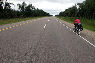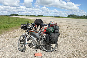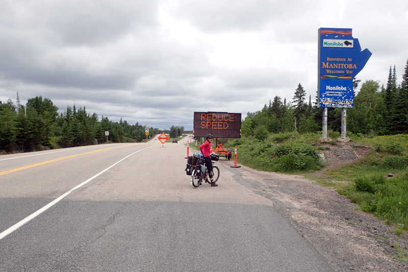 We have been wondering where the prairies will start and two cycle tourists we met at the info building told us this was after Winnipeg. However, the road into Manitoba was still flat enough for us! We made good time even though there was another stop-go. It didn't impact us though, although the wait would have been in the region of hours for motorists. As we passed them waiting, many called out "What's going on, is there an accident?". The queue stretched for kilometers. They are probably still waiting to get through. We have long stretches when no cars passed us at all and then a bunch would come at one. They are widening the highway which is clearly a good thing. The distance markers through Manitoba started the minute the Ontario 2 km marker became 490 km (this is the length of the Tran-Canada Highway through Manitoba). The highway here is divided and dual carriageway. There is a 23 km section which we did about 7 km of where the left lane is closed off as they are undertaking this widening task. At the same time the right-hand lane had no shoulder so luckily we could just ride in the closed off lane. About 5 km from our campsite we passed a motel which advertised meals and sat down to a HUGE hamburger, fries and onion rings meal. Delicious! So convenient to get a meal like this right at the end of our day! The campground is very good. We used our mosquito coils again and the mosquitos do not bother us. The black flies are now gone but there are thousands of caterpillars. They are everywhere, you even ride over them on the highway crawling around. We have a tree over our picnic table and the table is covered with caterpillar turds. You can see the caterpillars in the tree munching. The caterpillars started in Dryden. At first we thought they were cute, but now they have started to irritate us.