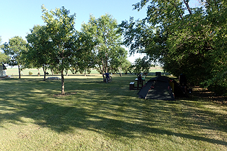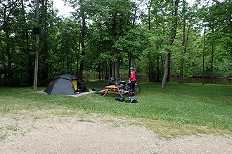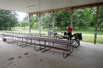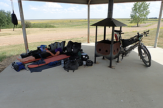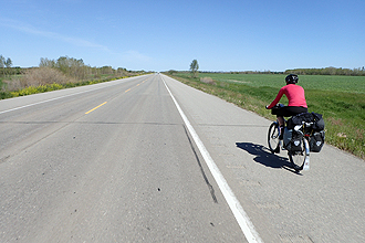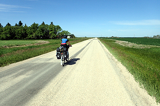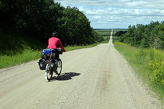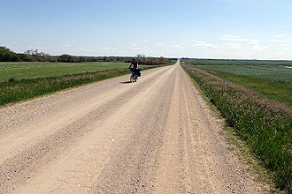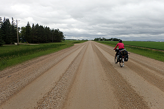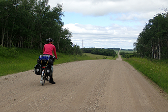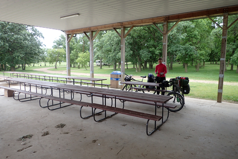 We stopped at the little grocery store first and then headed out on the main street which soon turned to gravel. We rode about 25 km of the day on gravel roads but they were good quality, ran through farm areas which were quite interesting and they seemed quite protected from the wind generally. They were a little hilly though and so far our assumptions about the prairies being flat are being turned on their heads. We then joined Highway 2 and had a strong crosswind/headwind. We rested at a picnic area with 25 km to go. My left arm was strained to the point of pain from keeping the handlebars straight and my back grew very tight. I could only manage 14 km an hour along this straight, flat highway in the wind. I just looked ahead as far as the next avenue of trees for some respite from the wind so that my speed could increase by about 2 km per hour for a brief moment. With 11 km remaining we turned onto Highway 5 and dropped down to the Provincial Park - our first in Manitoba. On the way in there was a take-away place and we had hamburgers, fries and onion rings which was a nice suprise! The wind is quite cold which is apparently unusual for this time of year.