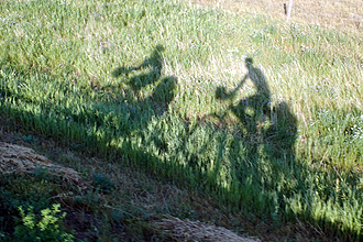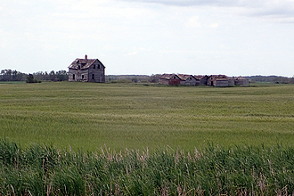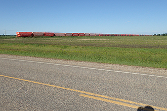 Although we knew we would have a headwind (Ye ol' westerly the prairies warn of) we had planned an ambitious 111 km day. After about 30 km we realised was were not going to be able to rise to this challenge. The road was good and the prairie scenery also good, we find it interesting actually but it is only day 2. One very interesting thing are the LONG carriages of trains which sit in sidings that dot the landscape. We had this headwind (gusts up to 60 km/hour were warned of) and also a bit of a climb up to the town of Notre Dame de Lourde (5 percenters on the prairies, what...?). These two things conspired to an average speed which was too low for a 111 km day. When we set off it wasn't too bad and our GPSs gave an ETA of 6 hours. It didn't get any less. After we had been riding for 2 hours it was still 6 hours predicted ride time! With a few climbs this grew to 8 hours. I lost interest after that.