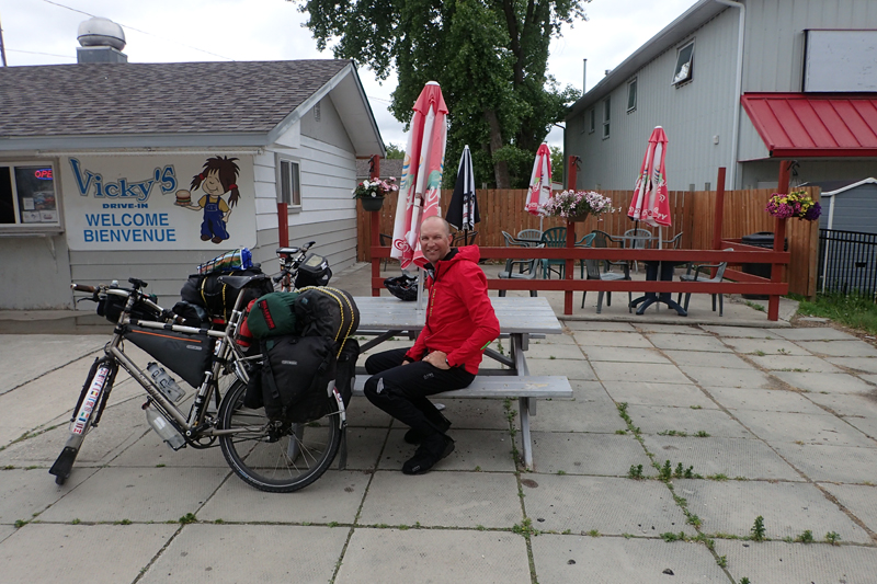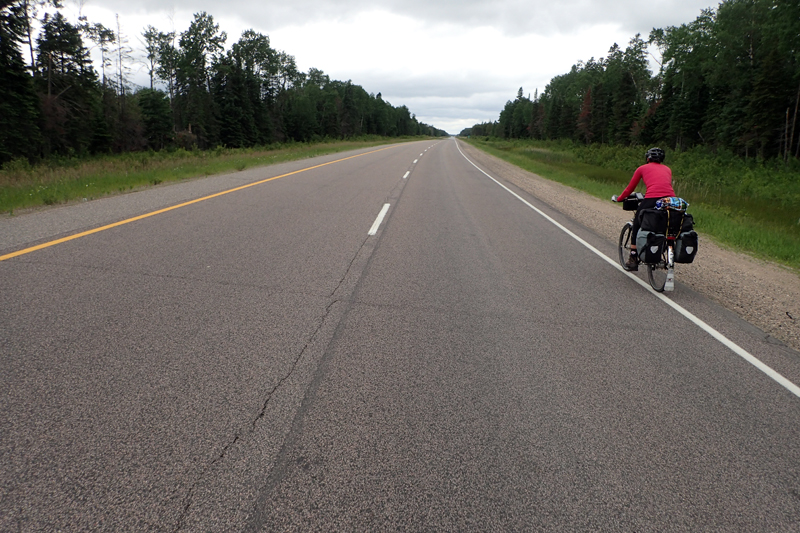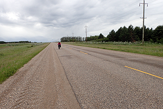 The highway stretched ahead, flat as you like and so the riding was easy. It is a dual-laned highway through Manitoba so seems quieter as you have no oncoming traffic a lot of the time as it's on the other side of the trees. Also not much or no shoulder a lot of the time. But as it is a dual carriageway this does not really matter yet, in our experience. The road was very wet though, we had a lot of rain. We also had a long way to go. After about 40 km we suddenly got a brand new super wide shoulder. In fact, the rest of the road was old so starting improvements with the shoulder was a great idea! We got exicited when we saw signs advertising hot meals at Geseppe's (on the left in 2 km) but when we got there noticed that it would be too much effort for us to get there. Due to the dual nature of the roadway, we would have to exit at the next turn left spot and then after eating ride back to the next turn left spot and then back to where we were. So near and yet so far. We satisfied ourselves with our flasks of hot chocolate which we haven't had for a while and some protein bars.