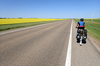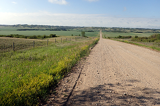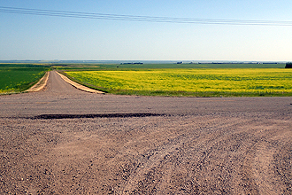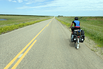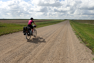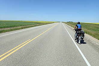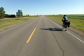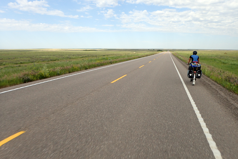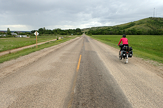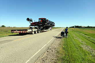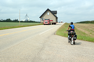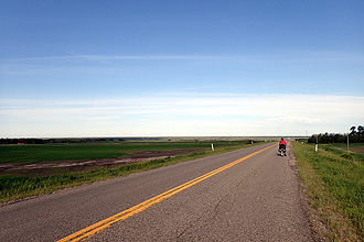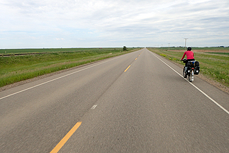 The weather is warm and getting hotter each day, but the overnight temperatures are still quite low and the mornings are cool. It is getting light at 4:00 am so we could be on the road by 5:00 am to miss most of the heat. We might try that...tomorrow! Today we got up at 6:00 am, the sun already high in the sky. We were on the road at 6:30 am, the road to Timmo's of course, for a great breakfast. We had a good day's ride along Highway 7. It is quite busy though, and also quite noisy. The surface was good and the route quite flat. We will never forget the endless prairie views; green, yellow and blue for as far as you can see.