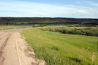 Today's ride was short and sweet. We continued along the valley from Drumheller for about 10 km, the valley walls being more of the same eroded rock walls we had seen since Dorothy. One kilometer from Drumheller, and linked via a little cycleway, is Nacamine, a tiny place with a grocery store that advertised camping. Had we known we would have gone there last night. There was a steepish climb out of the valley with lovely views of the valley floor below and all of a sudden we were back up on top, no longer surrounded by the dry prairie grasslands we had been used to since arriving in Alberta, but once again the green and gold of canola and barley. We could have been back in Saskatchewan!