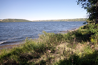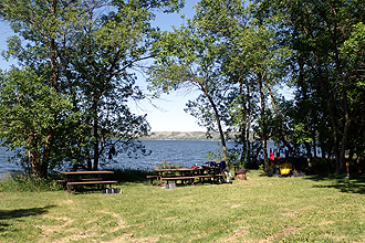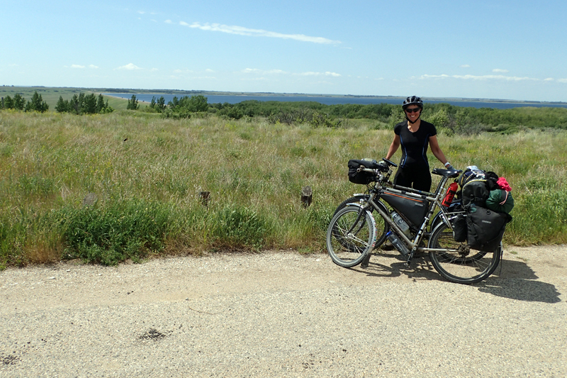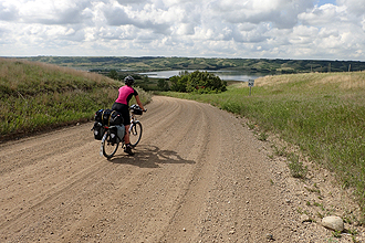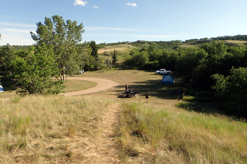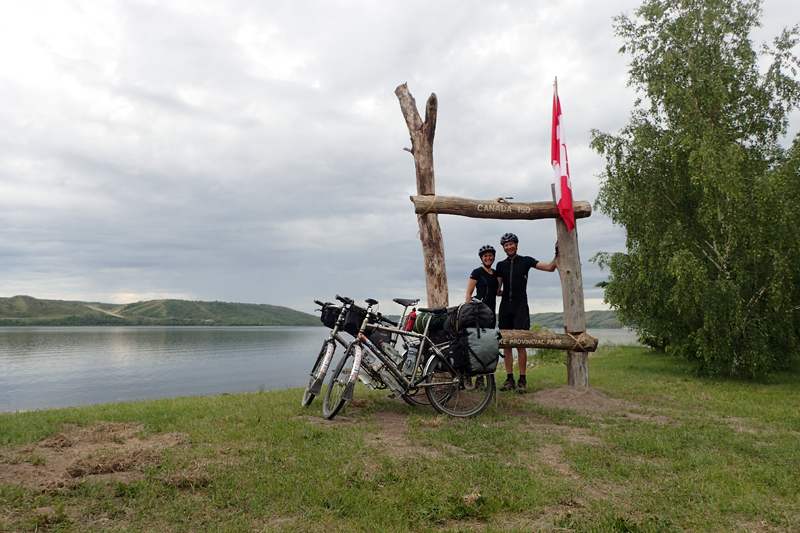 We had an easy 35 km along the main route and then turned off at Dubuc to ride the last 25 km on gravel. We had not expected it all to be gravel! The surface was not too bad and being freshly graded for the first 11 km (the grader was actually on the road) but the last stretch was on a busier road which made it very dusty. Some of the cars and trucks were very good and slowed down a lot for us, but most continued at their usual speed, drowning us in dust clouds. The last bit to the lake was down a very steep hill into the Q'Appelle Valley. It would have been unrideable going up it! The Valley is absolutely beautiful and rivals European river valleys. The Park is great and we have a fabulous campsite on the edge of the lake. Rest day here we come!
