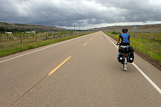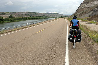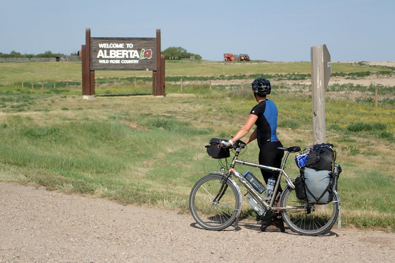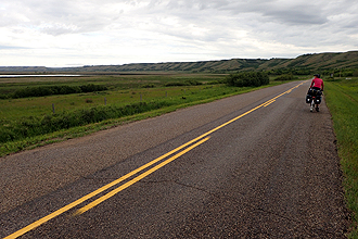 We had a tailwind again today, a raging easterley. This is very exciting for us! We did not leave the hotel in a big rush but we were on the road at about 7:30 am. We stopped at Alsask where we knew you could camp and it was a very nice spot from the looks of things. We weren't sure about water, but if there was not any on the site you would have been able to fill up at the gas station over the road, which also served meals. Of course, the Canalta couldn't be topped, but had we ended up at Alsask we would have been happy. We then crossed into Alberta and not much else happened after that. The road was a little hillier today and as well as the usual prairie canola, there was quite a lot of natural grassland which we thought pretty. Weo saw some very lucky cows along the way which look as if they have a couple of acres of grazing land each to themselves, or they've been put into solitary due to bad behaviour!