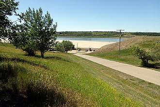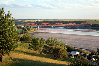 We were not able to check in right away but booked a campsite at the entry booth, before going back into town to buy food. There was a swimming pool at the park, but when I asked the campsite representative she said that it was permanently closed due to "the pipes shifting out of alignment". If the town is the irrigation centre, can they not sort out this particular problem? Anyway, the campsite overlooked the wide floodplain of the South Saskatchewan River which was pretty. The water appears shallow and the beach very wide. This river drains from the Gardiner Dam. I suppose that it used to be much bigger before the dam was built.