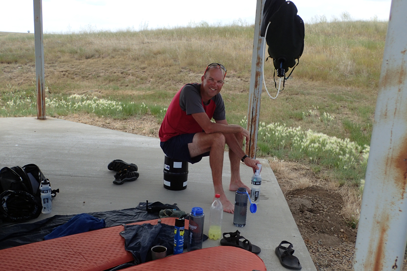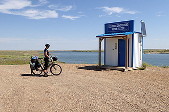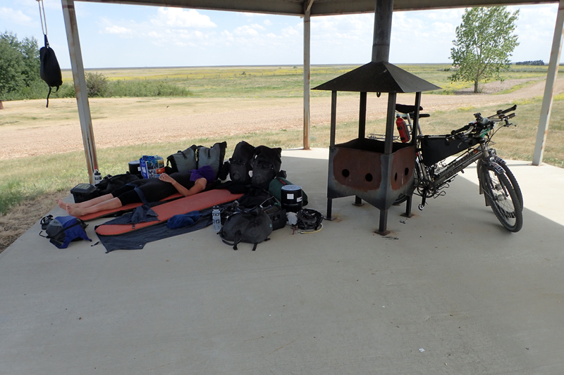 After all this we were exhausted and just tried to survive the afternoon as best we could under the shelter. We made a little barrier with our panniers for the wind and lay down on our mattresses with damp towels over our heads. Next to the shelter was some very outdated playground equipment, including a rocking horse type thing made of METAL. It looked like something out of Communist era somewhere circa 1965. Can you believe that throughout the afternoon, every so often a family would drive in to use the (pit) toilets or give the kids a break and they would sit on this thing and play on it? Backsides must be hardier than ours that's for sure! Anyway, eventually the sun did set, like around 9:30 pm and we had another quick HOT shower as the shower bag had been dangling in the sun from the roof of the shelter. Unfortuntely we had been plagued all day by horseflies and can you belive it; the black flies have made another appearance three provinces later? Round two.