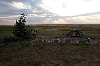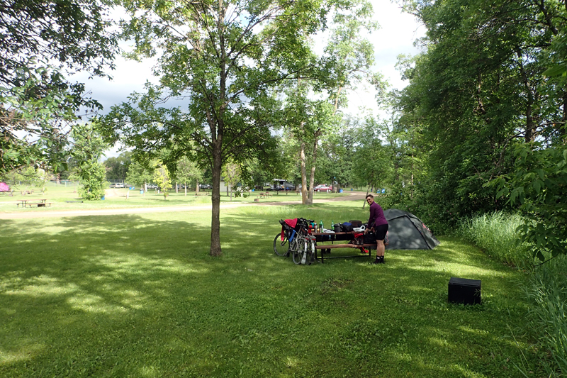 We were on the road at 8:00 am and the dune and woodland scenery suprised us. Surely the prairies don't look like this? The weather was quite grim, grey and dreary with drizzle. Headwind again, not as bad as yesterday but still made things very trying, especially for me. We stopped briefly at Carberry, just at the sportfield under a shelter to put on wet weather gear as the situation escalated. Shortly after we turned north for Neepawa, the farmlands rolling away to left and right. The road was flat, but the wind was punishing. Still, we arrived at Neepawa Riverside Campground at 1:30 pm which wasn't too bad. The campsite was lovely, an open area for the public with picnic areas, frisbee golf (the first we have seen in Canada) and a river ran through it. All beautifully mowed. We pitched the tent and chatted to some locals and two other trans-Canada cycle tourists. We then walked into town and bought delicious fried chicken and cinnamon apple pie as well as many other things to eat. We spent the afternoon relaxing both in and outside the tent, no bugs around. Tomorrow is a longer day but the wind, although still against us, should not be as bad. Manitoba weather amazes us, each evening the wind disappears, the sky turns blue, not a cloud in sight and a lovely sunset. Morning comes, a different story! Perhaps we should be riding from 6.00pm to 12:00am instead?