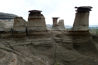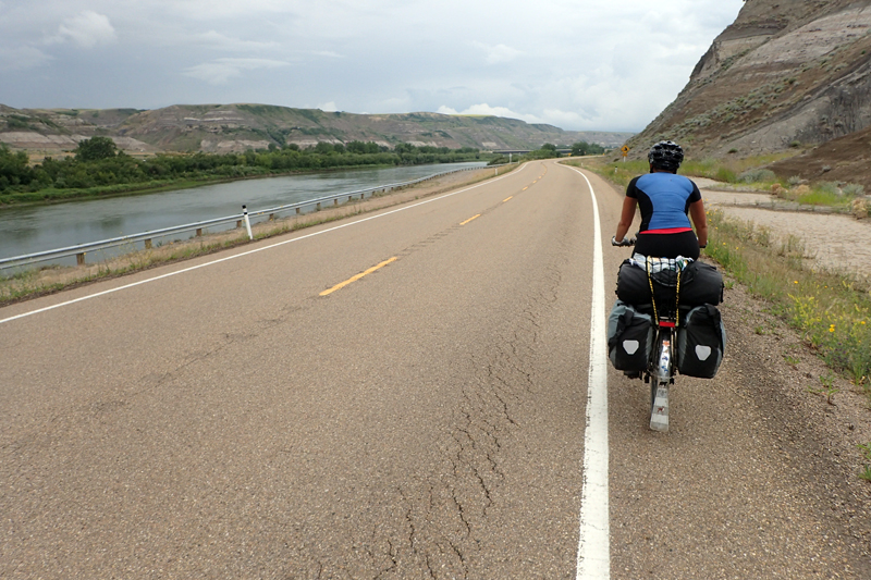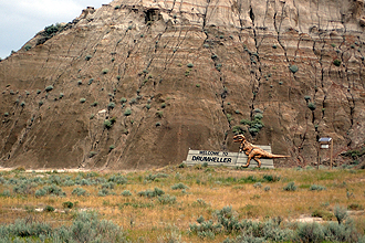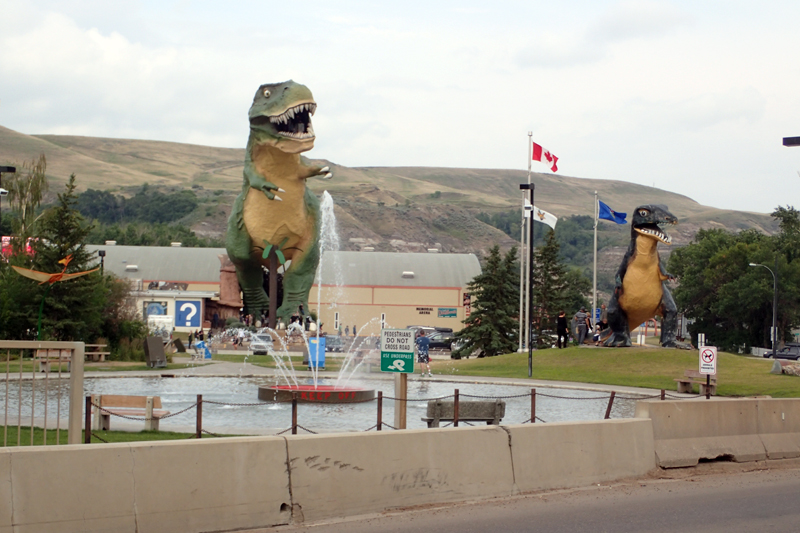Yesterday evening an older couple from Brooks, Alberta, called Helga and Dan parked near our tent in their RV. They kindly invited us for a bite to eat and we went along. It was pleasant chatting to them and hearing about their travel experiences. The family reunion was not as loud as we had feared and we had a sound night's sleep. We were up early and on the road by 6:30 am. The usual route to Drumheller is to remain on route 9 via Hanna, but we were to travel south from Oyen and then take the route 570 to Drumheller the "bottom way". We would really recommend this road. It is quiet but excellent quality. Alberta is definitely more arid when compared to Saskatchewan or Manitoba and the grasslands are given over to cattle farming, so not so much crop. The green and yellow stretching forever is a thing of the past for us now. It is fun to see cows again though! Another feature of the landscape are the oil donkeys, pumps which seesaw up and down to draw oil up. You can tell from the quality of the tertiary road that we are using that this is oil country. Oil money equals good roads the world over (we are reminded of the roads on the remote Shetland Islands, off the north coast of Scotland).