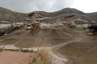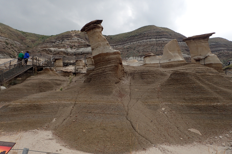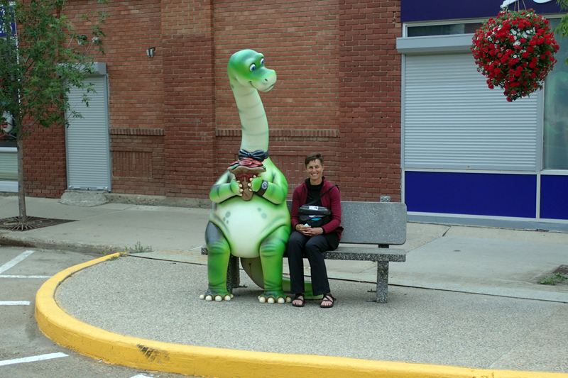 We had a very peaceful night. Our only neighbours were a couple from Munich, Germany who have been travelling North America in their campervan since September 2016. They had been to Alaska as part of their trip and were able to give us some info about the Top of the World Highway which they had driven and we are planning to ride. It set our minds at rest a bit as although we want to ride this road, it will be a bit of a challenge. We had a late start today as it was regarded a rest day, and thank goodness the day was quite cool and overcast. It was a short 21 km ride to the Hoodoos and was very picturesque. We stopped there and had a look around. The Hoodoos are sandstone outcrops formed by erosion. There were many people there, climbing up the hills. Shortly after the Hoodoos we lost that beautiful valley view that we had had at the campsite. The town of Drumheller is only 14 km on from the Hoodoos and our main destination was Tim Hortons which was busy. Drumheller has definitely capitalised on it's Unesco World Heritage Status and Dinosaur capital of Canada reputation. There is a dinosaur sculpture on every corner! Of course there is also the World's Largest Dinosaur Statue which we passed just near our campsite. It seems to be a BIG drawcard. It made me laugh a little as it is SO huge. There is a renowned museum a few kilometres away that is very popular, the Royal Tyrrell Musuem, but we are happy relaxing at the tent. The campsite is very busy.