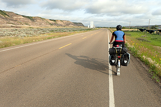 We began to think that with the small tailwind, we could tack on the extra 60 km to the Alberta border at Alsask, but we were a bit unsure of the campsite there and what facilities they had for tents. We stopped at the tourist office in Kindersley for some more info and a map of Alberta and then on to Timmo's for a planning meeting. It was only 11:30 am. Our recipe for dealing with hot days: go inside Timmo's and sit in airconditoned comfort, drinking iced cappucino's or chocolate chills until you are so cold that you long to go outside again. By the time we had finished two each we had booked a night at the Canalta Hotel on the edge of town. Timmo's makes everything clearer! The hotel is new, only 2 years old and is perched, well, on the edge of nothingness with a view of forever. The manager was very helpful, bikes went into storage downstairs and we went into a room complete with couch, footrests, king sized bed and bath. Fabulous! It was only 1:00 pm and we were checked in. We passed the afternoon rechecking the route and making some changes. Then out for a pizza for dinner (pizza place in the parking lot). The hotel even makes popcorn as an afternoon snack! Tomorrow we will be first in for breakfast, then Alberta, here we come!