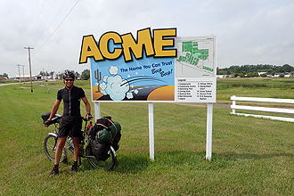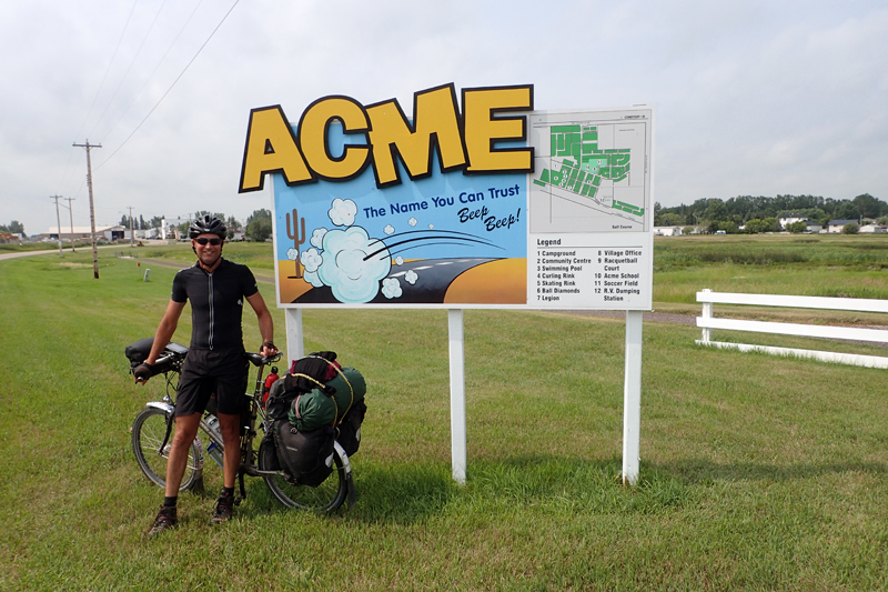 We were travelling on route 575 which is a great road once again. Perfect surface and shoulder. It was a little exciting when a one of the "oversized load" warning vehicles came towards us. It's always fun wondering what the load will be. This one was a complete double storey house! We wisely pulled off the road and waited for it to pass. We arrived in Acme (beep beep) and checked out Main St, and even the menu at the diner we would eat at later. We pulled into the Frank Fooks Memorial Park and this campsite was perfect for us! A few RV's parked in a circular area and many treed and well grassed spots to pitch our tent. We self-registered, paying less than half of last night's rate and set off to shower. The showers required a code to enter as they were at the town pool adjacent to the campsite. We thought we did not have it and asked at the pool. The pool attendant was very helpful but also didn't have it. He said we were welcome to shower in the pool changerooms, which we did. We then realised that the code was printed on the back of our self-registration stub! When we used them later they were pristine.