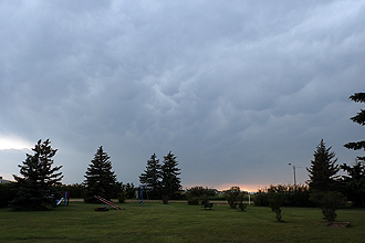 We stopped at Elbow to shop and it wasn't long before we were at tiny Loreburn. The campsite was brand new with lovely amenities, but it was a hot day and there was not much shade, so we relaxed in the nearby Centenial Park for a few hours before moving to the campsite. This is just our cup of tea, a site in a small prairie community. The weather has turned quite dramatic this afternoon and thunder can be heard from a distance. Murray wished for us to experience a prairie storm in all it's glory. We'll wait and see. We have pitched the tent snugly between a fence alongside a bushy area and a large van which is for sale.
