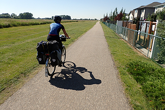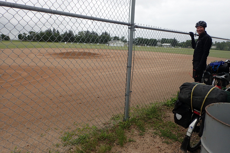 Our route ran along the railway line and I guess we will see many of the grain silos dotted along as we cross the prairies. We stopped at a roadside diner for lunch at Carman and then went into town to buy some supplies. We decided to go on 20 km to a provincial park to camp and were about 6 km down the road when Mike remembered that we had a package to pick up at the post office in Carman. So we turned back to get it. We had actually cycled straight passed it TWICE when going to the shop. Then the post office had a power failure and the staff told Mike that "they get so many parcels everyday it was not possible for them to locate it, try coming back in a half an hour". Really - Carman post office gets THAT many parcels? Anyway, we chatted to two ladies who invited us to a hotdog BBQ that evening and Mike went back in at 4:30 pm when they could help us and he got the parcel. By this stage we decided that there were too many reasons to stay in Carman so went back to our original plan and pulled into the municipal campsite. Seems a nice place. Hopefully won't be drive-by's tonight (shades of Thunder Bay!). People in Carman are super friendly. Showers are HOT and campsite costs $15 for the night!