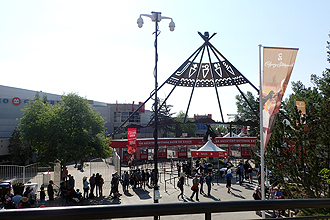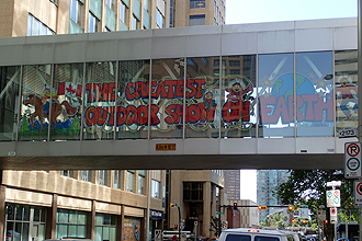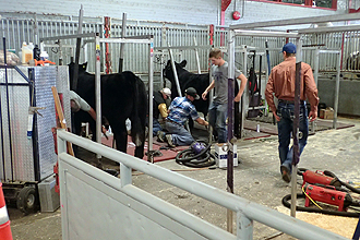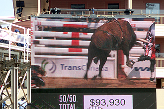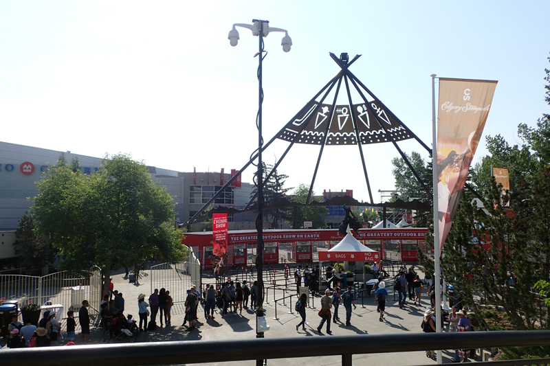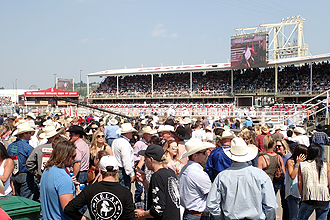 Rodeo Finals Day at the Calgary Stampede! YAHOO! The show commenced at 1:15 pm but we arrived by 10:00 am as we wanted to check out the craft and animal displays. We assumed it would be open early, but actually the grounds and exhibitions only opened at 11:00 am. Still, we were in the queue for the bag check and were inside by 10:30 am. We had a look at some wonderful stone carvings but still do not want to commit to the purchase as we are sure we will find a lot to see further north. Much of the work is done by coastal communities in the northern territories so we assume that we will come across more examples. There was a lot of wonderful fine art, paintings and sculpture. We had a look at the Indian Village, mainly a group of very sparkly looking teepees. The animal hall was great. We watched show cows being spruced up; a cow beauty salon complete with hairdriers, hair spray and all manner of combs and brushes. The cows were even having final haircuts with clippers for those wayward hairs. Never seen cows with such silky coats. We also met a HUGE horse called Mike. Weighed a ton (literally) - a heavy weight pulling horse. It was about 2.5 m tall. You couldn't believe it was real.