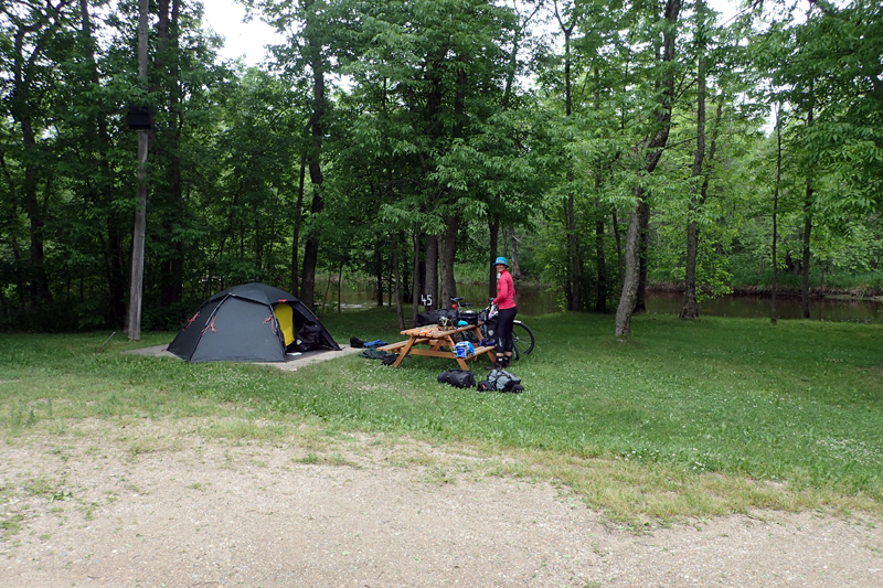 We had a wonderful sleep at Anicinabe and were up early. When we were sitting outside last night, a white-tailed deer visited and so did a white-tailed eagle. We had not seen either at close range before. We had to walk our gear up the hill and pack the bikes up there (where the cars park) as fully laden we would not have been able to push them up. But it was worth it! We skipped brekky and raced back to Tim Horton's for breakfast and coffee. Both were good. Passing the local Walmart, the car park was empty save two campers who were sleeping in lightweight hammocks that they had strung from the trolley storage bay to their car roof racks!