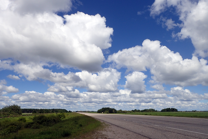 Today restored our faith in our journey! Light winds, almost a breeze actually! Not even a ridiculous stop-go where we had to wait for AGES and then it wasn't especially clear why we had to wait with the cars as our shoulder was open all the way. It was a long construction area, over 5 km. Along with the much reduced wind, we had blue skies and those massive prairie clouds and the 6 delicious muffins we bought at Tim Hortons when leaving Neepawa must have helped. We really liked Neepawa - it looked and felt like a town that had got it right. We followed the Yellowhead Highway and stopped a couple of times for rests (and to tighten a water bottle cage). Welcoming prairie settlements. We had a wide shoulder all day and the surface was reasonably good. Quite a lot of small lakes and reed areas and birdlife along the route.