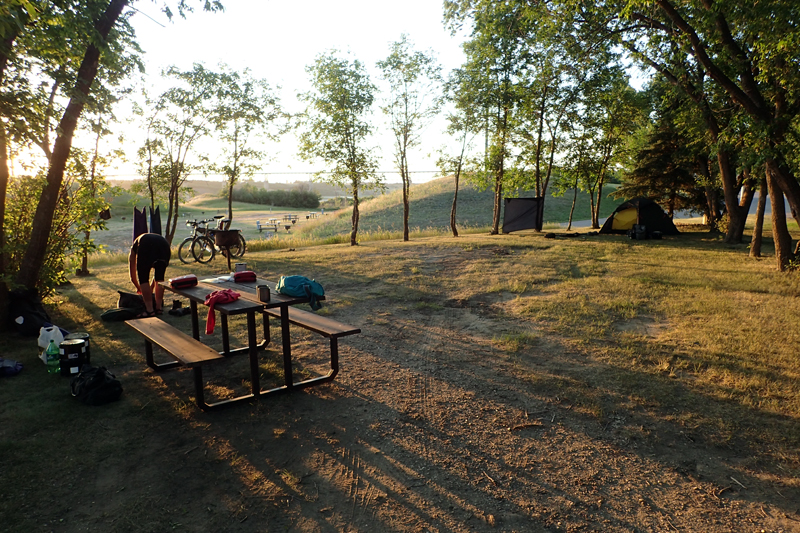 After Lemberg, the gale force headwind / crosswind hit and really wore us down. The road was good, with views over the prairies as far as the eye can see. It grew busier as we approached our end point and then we had a rollicking downhill run into the town as we descened again into the Qu'Appelle River valley. We stopped immediately to refuel at the pizza place/Robins coffee shop. We then picked up supplies and asked locals abut the local campsite. Everyone we have met without fail has been so engaging. Saskatchewan is a great place! The campsite was nice, but very windy. We went first to the municipal offices to book in but they were just closing so someone came to see us at the campsite. We had a long day... we had left at 7:30 am and by the time we arrived at the campsite it was 5:00 pm!