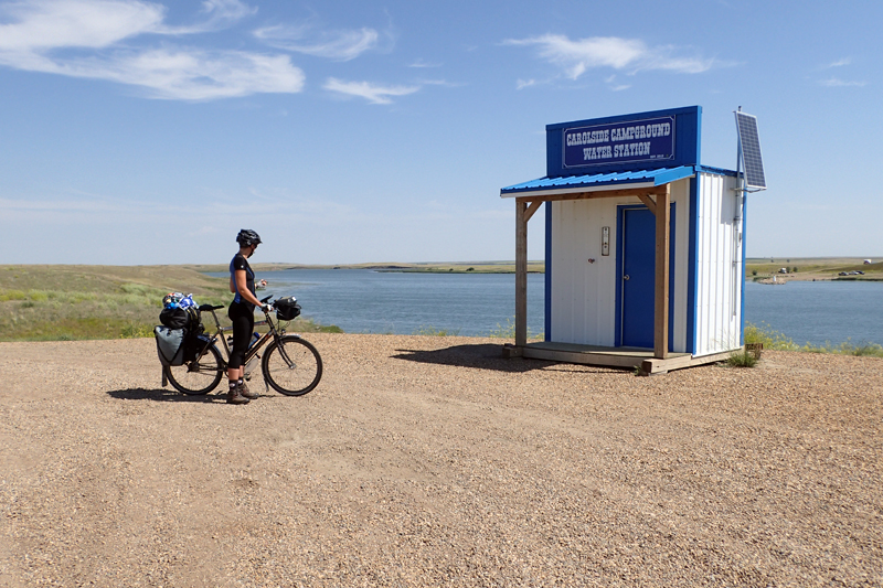 We arrived in Eyebrow which we knew had a shop but it was closed on Sundays. We were unsure of where we would camp tonight. We could stop 12 km further on at Tugaske or we could head for Elbow which would make this day longish at 120 km. Douglas Provincial Park sat in between but with the fiasco last night and it still being a long weekend, we were reluctant to go to another provincial park. We pulled in at a picnic site for a rest and found that it was a little camping area and there was only one tent there. There were no showers but there were lovely washrooms with hot water and as we carry a water bag with nozzle, that would work. We sat and chatted and thought about what to do. The tailwind was too good to abandon so had just got up to press on the Tugaske or Elbow, when a car pulled up and a man got out with his dog. We said hi and got chatting. His wife also got out the car. Amazingly they ended up inviting us to thier cabin just before Elbow for a BBQ dinner and to pitch our tent in their backyard!