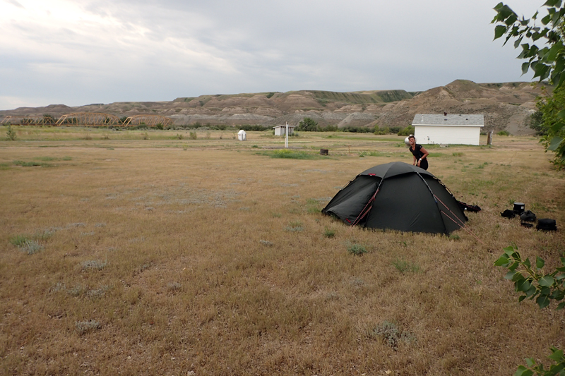 The wind really whipped up last night and it was noisy in the tent, and still quite warm throughout the night so we didn't sleep very well. We had another early start, both feeling a little rough. Again we had a good wind for the first half. No services or towns on the road today again so we just kept pedalling. The road continued very nicely and we were grateful for it. It seemed a bit cooler today as forecast. All of a sudden, at the 40 km mark, the wind changed in intensity and direction to a westerly, and as we started the descent into Dorothy and the valley, we had a very strong headwind. The last 2 km are very steep down and it was tricky riding down the slope into the wind. As we passed Dorothy with it's original grain elevator that was saved from demolition we saw the Cottonwood Campground. We had seen reference to this online but no actual information and in the last Google streetview picture we had seen, it was closed. Today however it was open and although basic, exactly what we were after. It meant a short day, but a quiet campsite. After this the sites towards Drumheller would be big and busy. There was only one other RV parked at Cottonwood and the washrooms were good. We decided to camp here tonight and then have a 30 km ride into Drumheller tomorrow as we have some time to kill before we get to Clagary (Airdrie) on Thursday. We pitched the tent as it was overcast and then had about an hour of rain. After that it was quite hot again but we coped by having cold showers and sitting in the small bit of shade. The views of the "Badlands" are good and we will check out the Hoodoo's tomorrow.
