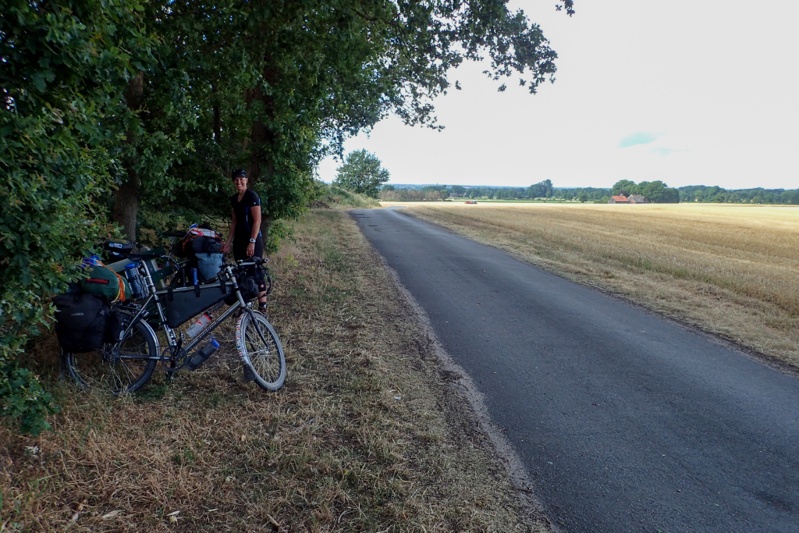 Our camp is in the coolest spot, on the edge of an oak forest along a wheat field. With a sunny afternoon on the cards we chose a grassy bank overlooking the wheat. Mike had a walk to fill two water bags at the nearby stream and then I went after to do the "washing" of the cycle clothes. I use the term loosely as dousing socks, gloves etc. that have been used for a week in 5 L of river water once or twice does not a laundry-woman make, but better than nothing! After this is was 17:00 and of course it had clouded over so we can only hope everything dries by tomorrow. Of course we have more than one pair of cycling clothes, but carrying wet gear on the back of the bike looks unprofessional!