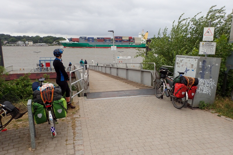 Another day's ride through peaceful rural Germany! As it was Sunday the shops don't trade, but the bakeries are open so we stopped early at one for delicious fresh buns. We stopped soon after for our morning flask coffee break. We were headed for the Elbe River which we would cross just west of Hamburg. We were not really interested in seeing Hamburg. It was a cool day and a bit breezy, although the headwind would really kick in towards the end of the day. We passed the Hamburg Airport on the way to the river. We caught the Teufelsbruck ferry which had space for bicycles. As the Elbe is busy with barge traffic and the ferry crosses this at 90 degrees, the ride was short and VERY bumpy. You could barely keep on your feet! Bicycles fell over if left unattended! The trip was about 5 min and then you emerged on the Hamburg side of the Elbe. The route ran along the river for some kilometers, very scenic.