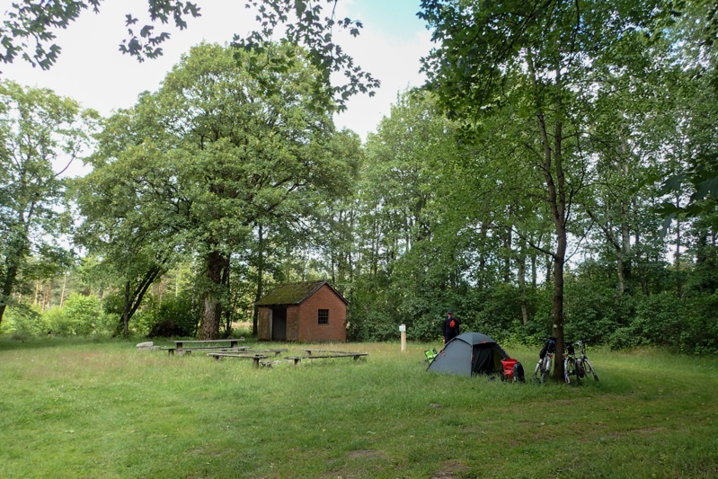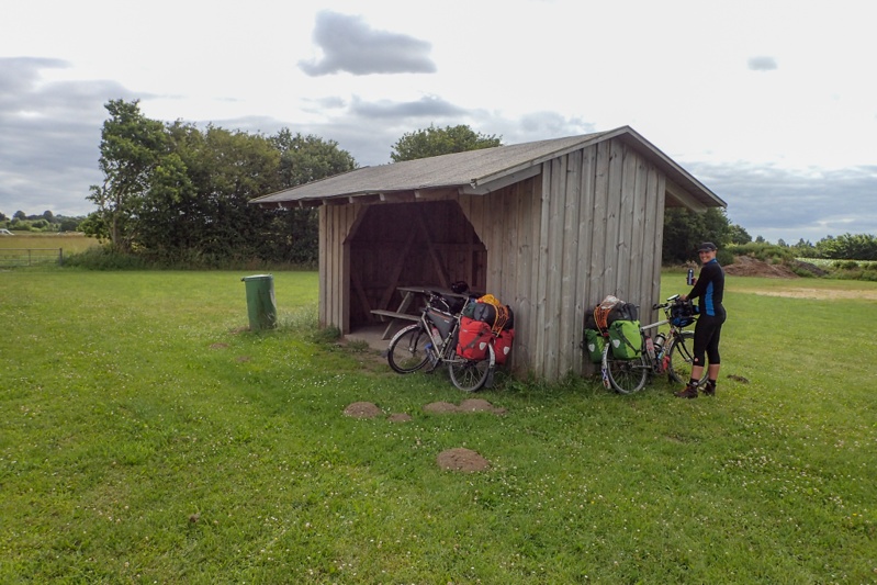 We pitched our tent inside one of the shelters at about 19:00 and were in bed around 21:00 due to more rain, when of course two other cycle tourists arrived and proceeded to talk very loudly about all sorts of rubbish (one was particularly loud). They were British and seemed opinionated, particularly about a weather app they were using which had disappointed them apparently. Eventually Mike asked him to pipe down. Then two Danish cycle tourists arrived at 22:00 and all four men slept in the shelter next door to ours. We did have a peaceful night eventually.