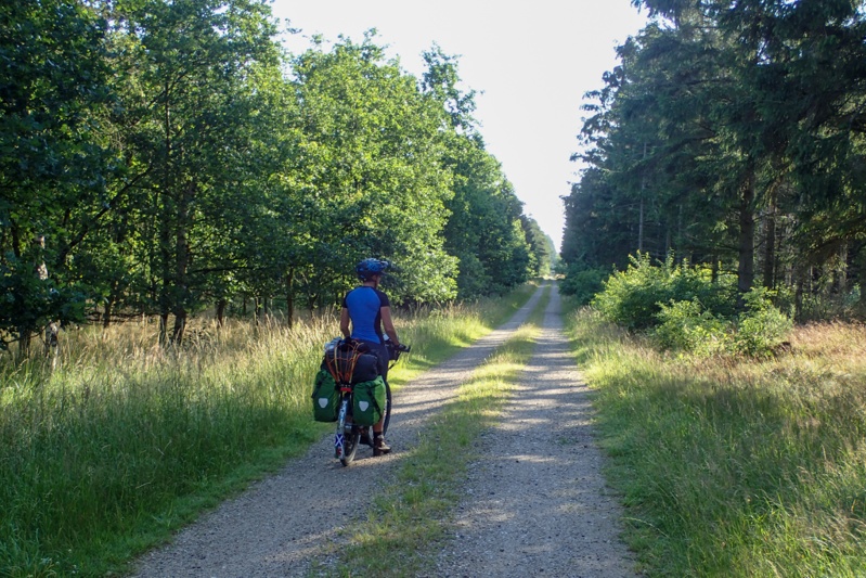We started our ride through the beautiful Rold Skov woods near Arden and checked out the amazing shelter place they had there. There are little wooden shelters for sleeping in, with lovely forest views and toilet and drinking water, as well as the lake close by. All free camping. There was a lady sitting at the opening of her shelter, knitting in the morning sun! The route through this section was very pretty and we stopped quite early in the day for coffee and buns in a meadow with our first Danish sheep! After this our beloved H??rvejen took a turn for the worse, going to very rough gravel walking track and finally deeply-rutted single track, where I fell off my bike, no serious damage done fortunately. After this we went through various stages of hating H??rvejen throughout the day. The route just really changed today, the scenery was still lovely, but the route was mainly on very bad off road surfaces. Aarborg, a big town en route today, had a bad entry into it on these rough little roads for cyclists, and once we were in there it was not cycle-friendly to navigate. There were a lot of roadworks which didn't help. We were happy to leave.