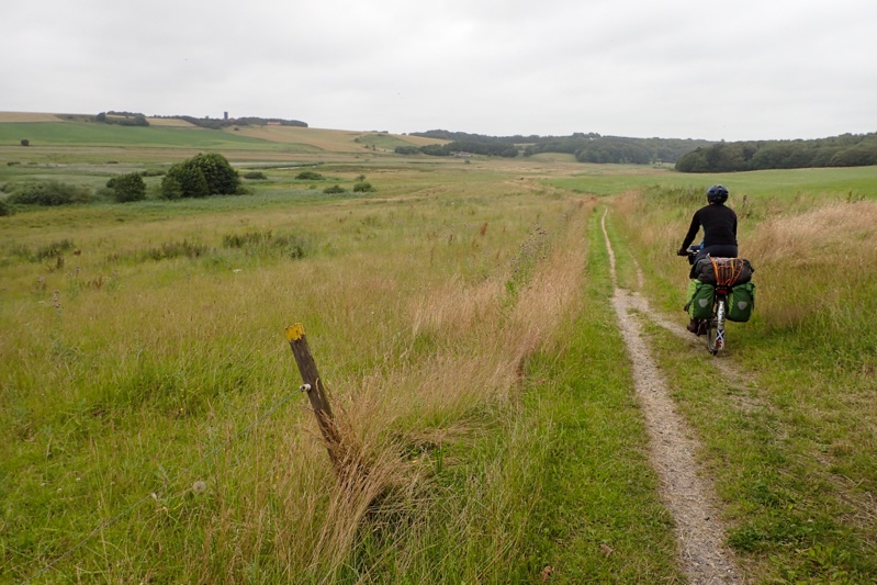 Another pair of cycle tourists arrived last night after writing, with a small baby that one of them pulled along in a trailer. We are starting to see more cycle tourists which is interesting. The baby was very vocal and seemed excited to be there. Probably just stir crazy from being bounced about all day! We got an early start at 07:30 as there was to be a head/cross-wind today which would grow in strength. We made good progress today, again a combination of quick cycleways along main routes and cycle routes which deviated on all sorts of terrain. It makes it interesting to decide at an intersection which way to go. It was quite cool on the bike today but the sun came out now and again. We have had cloudy weather for many days now, those first three hot and warm days cycling out of Amsterdam have been followed by pretty average weather. At least it's not UK grey though, the clouds tend to be big, white and fluffy. We stopped after 30km at a football field for raisin bread and continued making good time. Something that really stands out for us about this part of Germany is how very quiet it is. I know that I have remarked on this before, but it feels strange to cycle down main streets of villages and see no one at all. The villages are obviously lived in and most are very pretty with well-tended gardens full of summer blooms. Maybe they all leave early for work in nearby towns?