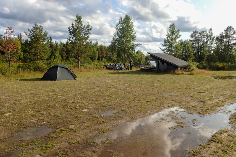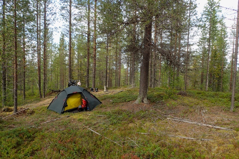 After Muonio we had a slight climb past some ski fields and about 15km further on we found a good camp spot. There was quite a busy rest stop with toilets and benches by the lake and just before it in the forest we could pitch our tent, so we have the benefit of the facilities, and peace and quiet! Around 17:00 the peace was shattered by a huge thunderstorm with very heavy rain. What is with this place?! Anyhow, the next few days look to be good weather!