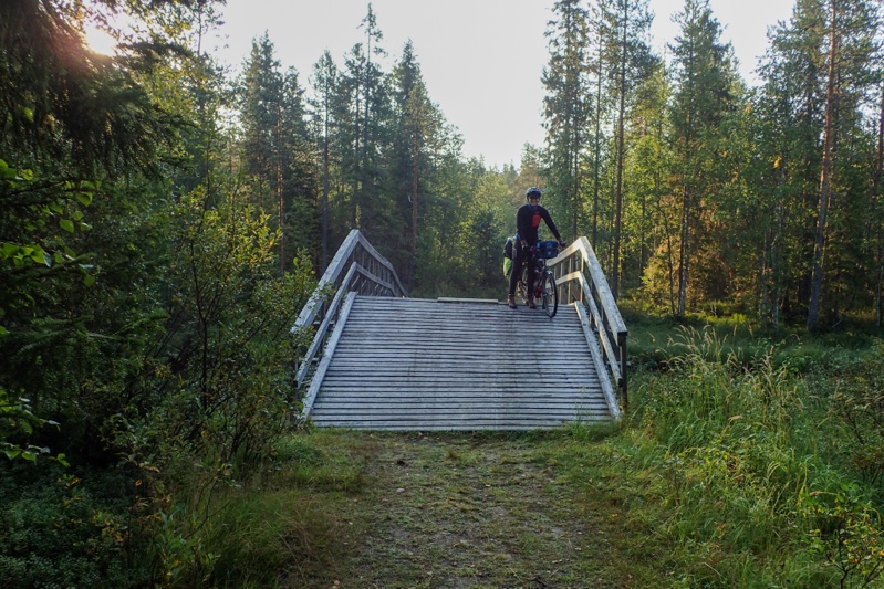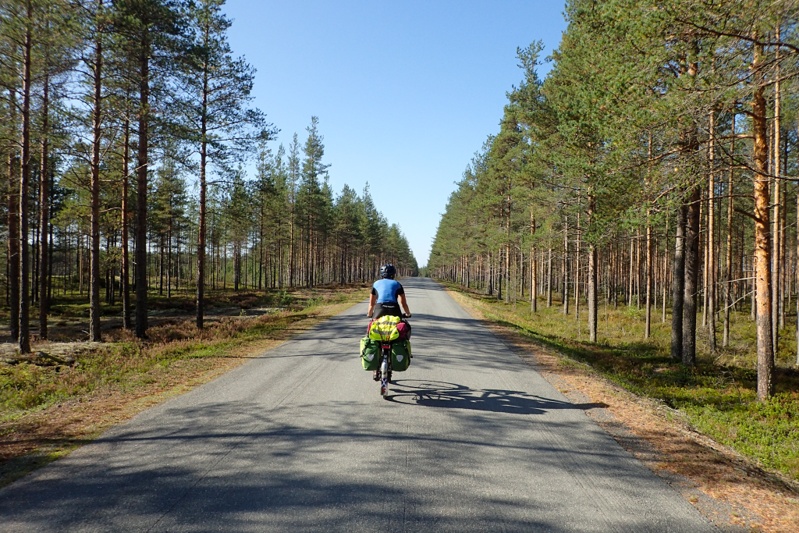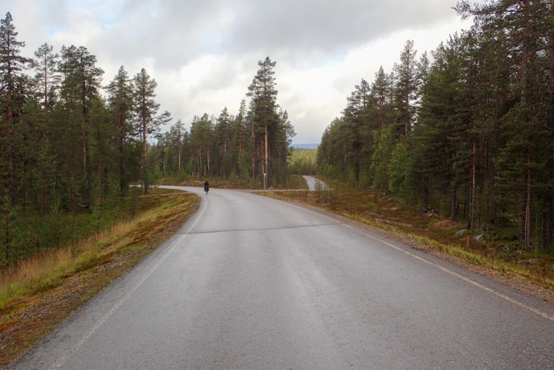 Riding in Finland is pretty easy. You just seem to roll through forest without much effort. Each time we came to a village or settlement we had a fabulous bitumen cycle path. At one of these villages we had the company of a dog who appeared galloping along beside me and would not be dropped even by Mike, pushing out 30kph speeds. The dog just ran alongside, faster and faster. This continued for over five kilometres until we hit a slight downhill and just pushed as hard as we could and left him behind. Muonio was the town of the day where we would buy food. It was a pleasure spending Euro again, the numbers are easier to deal with!