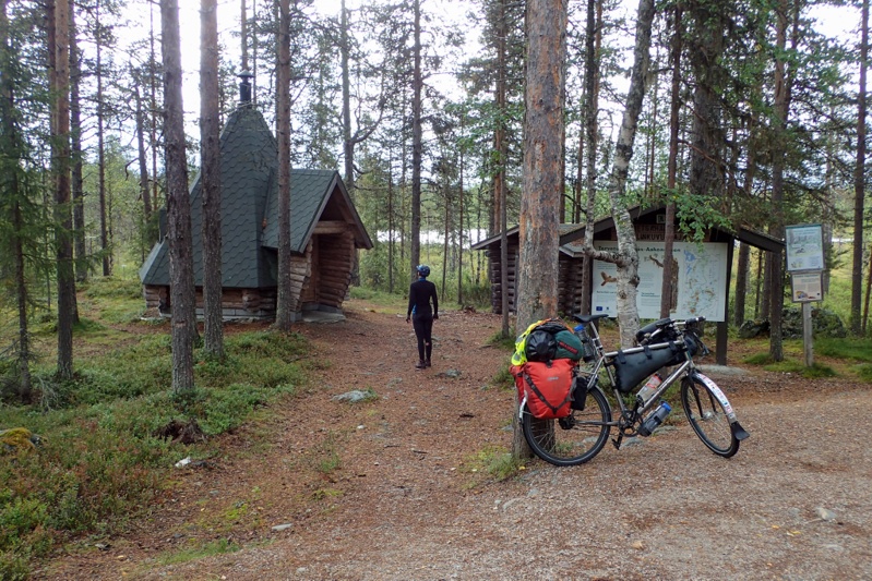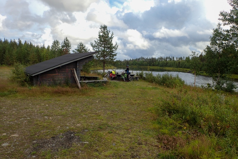 We have been continually lucky with the weather, until today! The rain started about 7km in and rained quite heavily off and on until lunchtime. The route was brilliant though. We turned off the road we camped on (the 79) after 5km onto a minor road (930) which was actually a single track road with passing places, to our surprise. Brought back memories of the Scottish Isles, except there was about one-thousandth of the number of cars! After some way we turned onto an even more minor road (9305) also single track, all bitumen. Both roads were deep in the forest, so we saw quite a few reindeer. The 9305 passed through a National Park which was lovely and we stopped at a fabulous kota (see pic). It was fully-enclosed with windows and beautifully clean inside with indoor cooking area. Such a pity we had only cycled 40km or we would have stayed! We decided to keep an eye out for other kota's as our laavu map showed the river route we were on was littered with them. We stopped at two but they had just vanished! The sites looked disused. Funnily enough this happened once in Sweden too just before Karesuando. We had even seen the photo on Google Street view that time but "whoosh" it had gone. It's a mystery. We were hacked off as well as the second one we stopped for entailed a bit of a ride off the road on gravel and a massive mound of dirt that Mike manhandled both bikes up and over and then again on the way back! Not Finland's fault though, just the laavu sites need updating on the website we used.