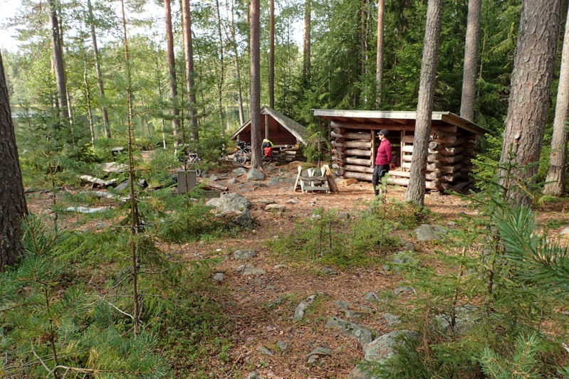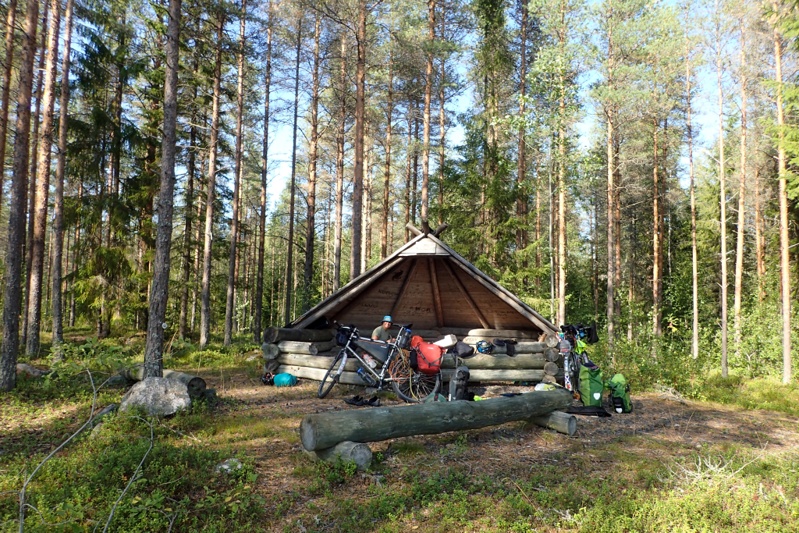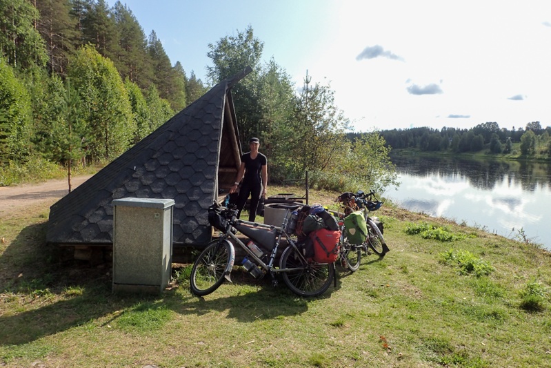 We continued and rejoined the 79 to the big town of the day, Kittäne. We stopped to shop and bought a delicious warm lunch at the K-Supermarket. I suddenly remembered that many of the supermarkets sell warm food so we had delicious potato bake and roast chicken. After this we had 15km to go to our "keeping the faith and all our fingers crossed" laavu. It was shown on an information map by the roadside also so we were optimistic. We turned down at the shooting range on a gravel track and then rode through the shooting range (open air!) to the river where a brilliant site awaited us. Perfect laavu, pretty new pit toilet (you know it's new when you look inside and can't see the bottom!) and massive wood store. You feel so looked after on a trip when you come across this sort of thing! We had a cold river swim and got a fire going. It turned out to be a very sunny afternoon which was good for charging some things with our solar panels (they have been out of work lately). We were driven into the tent in the early evening by the damn sand flies again. They are a total pain, but you can't do much about it.
