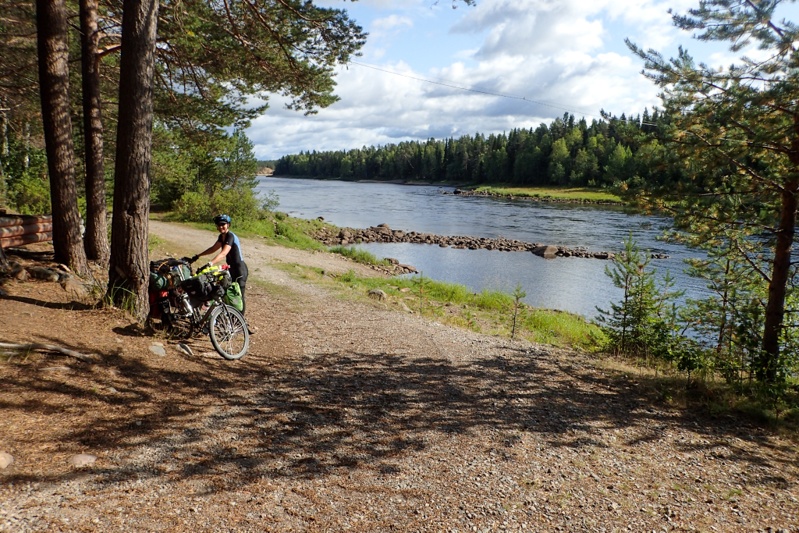 We left our hotel in broad sunshine around 11:00 and were so pleased that we had all the rain over the two days that we safely inside our hotel room! We had a short day today and it was an easy one. Effortless riding through forests and on good roads along the Kemijoki. We stopped for coffee at a laavu and passed a few more before reaching ours. All the laavus along this river are signposted along with their boatramps, as they were on the Ounasjoki. The laavu area was beautiful with a great view of the river. Unfortunately we were met by a plague of blackfly and although we managed to swim and filter water, we were driven into the tent. The spot was popular for fishermen who came and fished off boats. A couple also came to cook their sausages at the laavu. They made a big fire and to our surprise, once they had eaten then got in the car and drove off leaving two large logs still burning, flames leaping from the top!