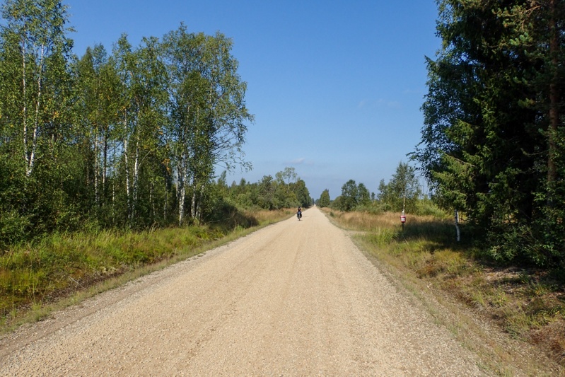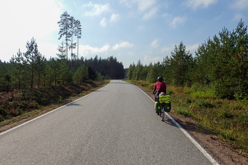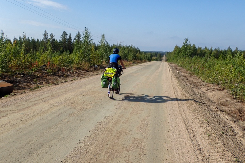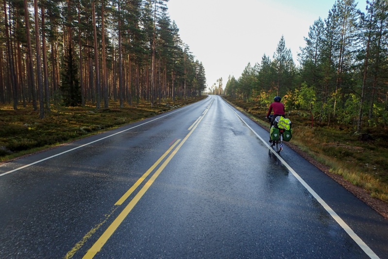 Late in the night someone was driving a motorcycle or quadbike with high-revs deep in the forest. It was far away from us but just back and forth, back and forth. Then just before dawn the shooting began. It sounded as if perhaps the biker was disturbing game for the hunters to shoot? Perhaps hare or grouse or something. The shots were fired also deep in the forest but in quick succession followed by a long break. No idea really, but we realise it is best to be aware of hunting now. The moose season starts tomorrow. We pushed our bikes from the forest this morning and as I hopped on mine I knew I had a rear wheel puncture. It was upsetting but it was also our first puncture of the trip. You can't really complain after 8,644km! Of course the bike had to be unpacked then and it took us ages to find the hole and fix it. We ended up starting the day at 08:40. We knew there would be a headwind today and there was, right from the start.