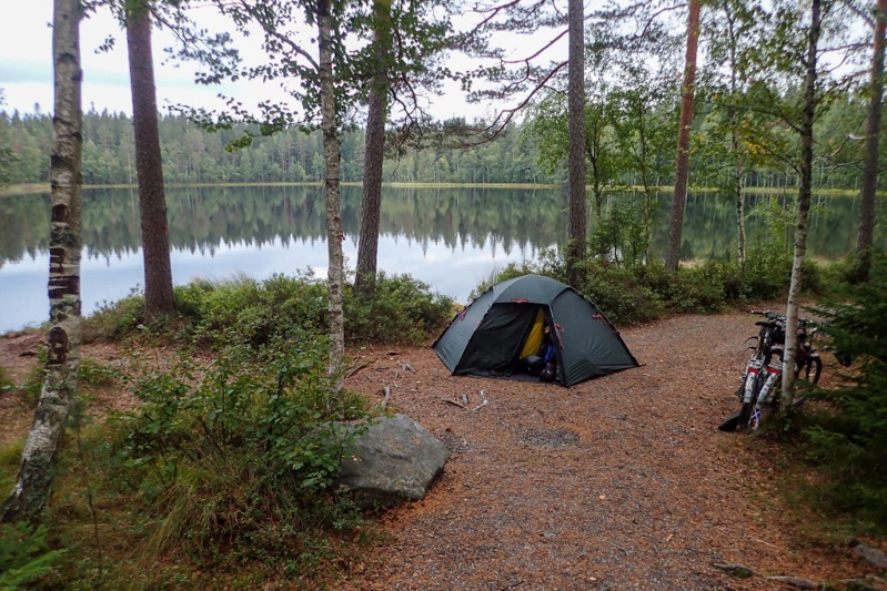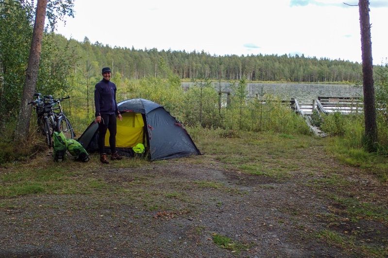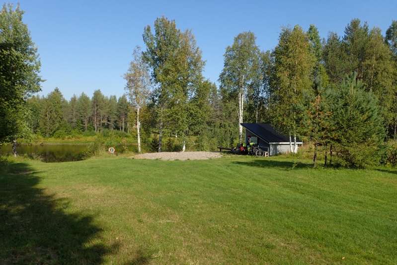 We had a sunny day on the bike today which we appreciated! We had the usual mix of dedicated cycleway (we were surprised again by how generous these are even in these areas), gravel road and other sealed roads. Still plenty of farmland and we had two small towns en route, one with a Lidl and K-City Market which are big stores! We took advantage of the sunshine to continue drying out wet gear from the two rain days we had and also charging using solar power when we took breaks. We still had a southerly wind to make things challenging, otherwise the route was flat and good. The farmlands were lovely in the autumn sunshine. We were headed for a lake laavu and had about 10km on a busier road to get there, turning off onto gravel for the last 7km or so. The laavu was on a lake so clear and cold we couldn't believe it. We had not had such a cold swim in ages. There were a few buildings around the laavu (which was really just a cooking spot, see pic), one was a lodge of some sort, and we later found out it was a hunting lodge. It probably would have been fine to pitch the tent but it felt a bit weird so we backtracked to the forest we had cycled through and found a great place to pitch the tent on the reindeer moss. The forest is quite open here as it is new growth, having been cleared a couple of years ago it would appear. We had a relaxing few hours sitting out in the sunshine on the soft mossy forest floor. It was a tiring day. We have decided that as we have time on our hands, we will rest here tomorrow. Rain is forecast and tomorrow's ride is over 90km so we don't want the pressure of chasing the rain. We have only about 350 km to Turku now and excluding the rest day we have 6 days to ride that in, so we are going to treat ourselves to sleeping in a bit now and taking it easy!