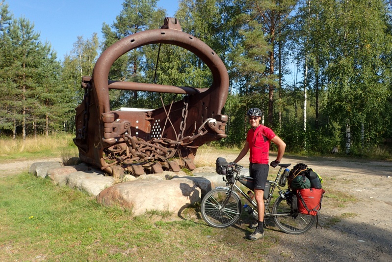 We woke after 06:00 to the clippety-clop of reindeer hooves tripping down the path to the laavu and then halting abruptly at our heads and veering off into the bush. When we got out of the tent there were clear hoofprints right at the tent. Time to get up! We had a great ride today, the weather was perfect, if a little too warm for this time of year; it got to 23 degrees C today which is probably warm for this area at the end of August. There is rain forecast for tomorrow so the weather may be a little unsettled. We knew that today's route would be downhill and it certainly was effortless. The roads were quiet and good to ride. We stopped for flask coffee in a small town and saw a road sign warning of roadworks on the main road to Oulu; luckily that was not our route. Big town of the day was Ii and we didn't stop there. We did however stop just before to admire a massive piece of dredging apparatus!