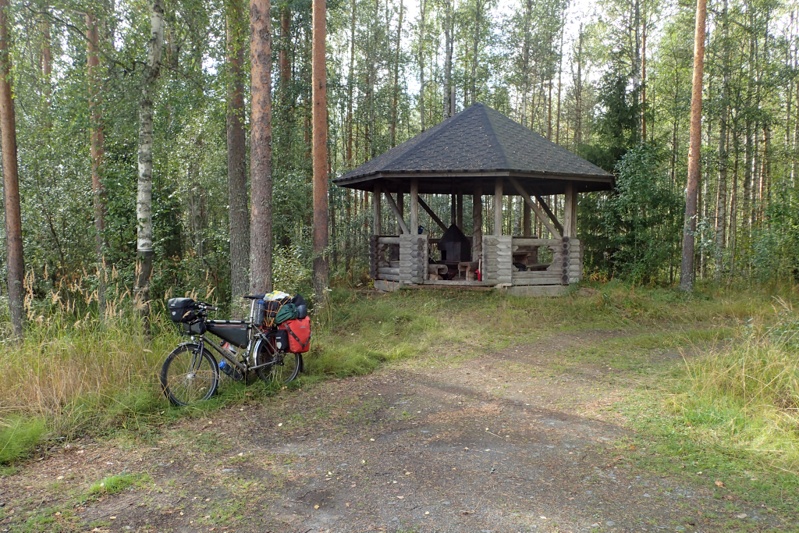 Our campsite last night was completely silent. The silence was deafening! We were woken this morning by a pair of trumpeter swans on the pond. At least I think they were trumpeter swans; they looked like swans and they sounded like trumpets! Mike checked his watch and said, "5 to 6? why so dark, is it overcast?". He put his head out the tent, "No, it is completely clear!". I mumbled something about getting up in a little bit, but he was keen so we were up at normal time, just after 6. To see the sunrise! Appparently it is now rising at 06:30. Quite a change. Must be autumn! We set off at 08:00 and by 10:00 were putting on wet weather gear. We had heavy rain today for the bulk of the ride. We also had our ever-present southerly wind which makes the going tough. The route itself was great. We aren't following the main cycle route along the coast as we want to make use of inland laavu's and of course the coast presents problems with water. We like our route though, the smaller roads cross farming areas and forests and small villages. It is interesting that in the western part of Finland almost everything has a Finnish and a Swedish name, that is even the street names sometimes. We stopped for shopping at an S-Market, about 20km from the end of our day. The S-Market is good for us as it always has tap water available to fill up. We filled up our shower bag as well as we weren't sure whether to stop at the first laavu which did not have water, or the second kota which was on a lake. The first option was not all that great as the laavu was right at a communal building or cottage of some sort. We pressed on along the little forest track to the kota which was wonderful. So well-built and clean and all the firewood you could want. We made a fire and spent the afternoon in the kota warming up and drying out. The rain stopped during the afternoon and we hope for a sunny day tomorrow. According to the weather forecast there is more rain on the way over the weekend. We clocked a total trip distance of 9,000 km today.