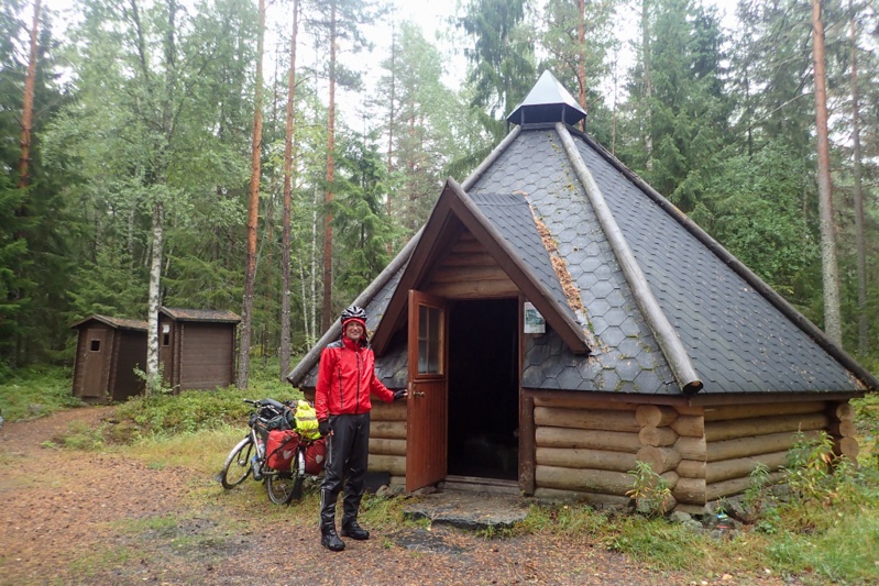 After the sunny warmth yesterday, we had a wet day today on the bikes. We slept well in the laavu and woke at first light (now 06:48!) as we wanted to limit our time in the wet. We had a quick 26km to Eura, our town of the day. We had a few km's riding on the E43 before Eura and then a good cycleway out of Eura. We made it to the shelter of the K-Market before the rain arrived which was a relief! We did some shopping for food and then sat inside at a little table and had our coffee and bickies. As we sat looking through the window at the heavy rain our thoughts turned to wonder, "Can we make it to Turku today?". The thought of hunkering down in a laavu for the afternoon while the rain poured down made an extra night with the nuns seem attractive. We worked out that it would mean a 116km day to get all the way to Turku. We decided to make our final decision at the turn off to our laavu in about 26km. We put on our wet weather gear after our break and the showers came through on and off. It was pretty wet. We rejoined an actual cycle route which we have not been on for a long time. This took us onto a gravel road for a stretch. When we turned off the gravel road we stopped in a bus shelter to have something to eat. We had 3km to our planned laavu, so had to make a decision. Looking at the weather radar online, we could see that there would be some very heavy rain this afternoon and that the weather actually looked better tomorrow, with the rain clearing by 09:00. We decided to stick with our original plan for the day of 55km, staying in the laavu and then the last 67 km into Turku tomorrow. The laavu is in a nature reserve and very well-built, like last night's one, but smaller. Finnish laavu's are always 100% watertight as they use waterproof material on the roof, unlike our experience of Swedish laavu's which leaked like sieves in the rain! We set ourselves up in the laavu after our last cold swim of the tour! It is quite snug in here sitting in our sleeping bags watching the heavy rain fall. It feels like the right end to the tour.