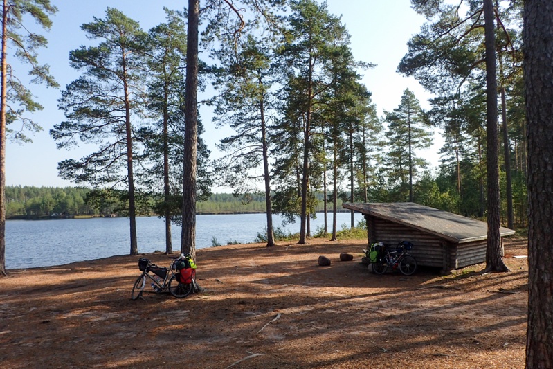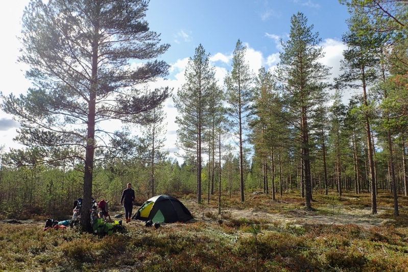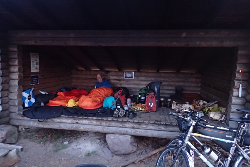 We got to our laavu before Ranua and as it was a way from the water we rode down there first to have a swim and then came back. We met a man collecting berries. He showed us his haul which looked good to us but he seemed disappointed. The laavu does not have the usual bells and whistles i.e. wood store and toilet. It is small and looks to be just for locals on the nature walk that passes here. Good enough for us though! We were both exhausted and pitched the tent and had a sleep for over an hour. As we woke up a couple came walking past and gave us the thumbs up! We hope we feel better tomorrow.