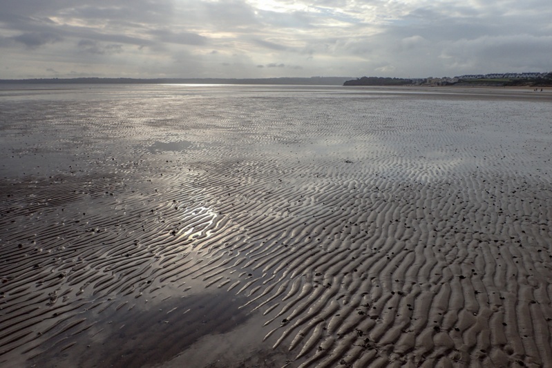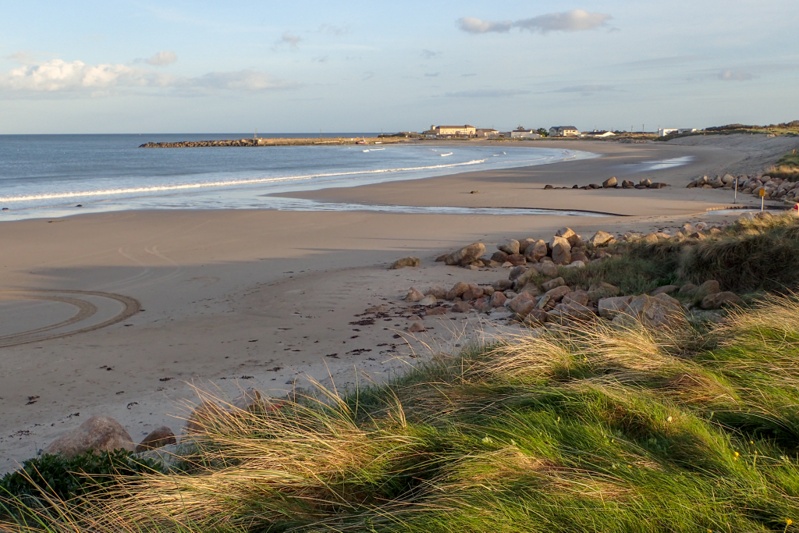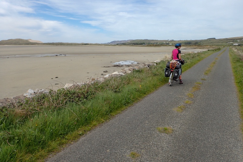 We only had around 20km to go to our campsite on Tralee Bay, named after a British revolutionary/Irish Nationalist who came ashore here on a dingy after being dropped off by a German U-Boat in 1916, Sir Roger Casement. We drew down to the coast and cycled along mainly dunescape and estuarine lowlands. There were cows walking about the place, on the road and so on. We snuck past under their noses as there was a calf with them. They seemed unworried. In the distance in the water of the estuary we could see a cow and four calves walking about. Perhaps an ill-timed trip down to the seaside? We stopped just before the campsite at Banna Beach, where Sir Roger came ashore after his dingy capsized. Not a jolly thought. The sea was quite calm and the beach stretched for miles. A few brave souls about.