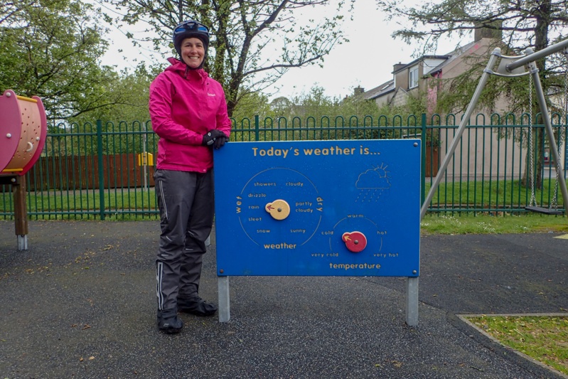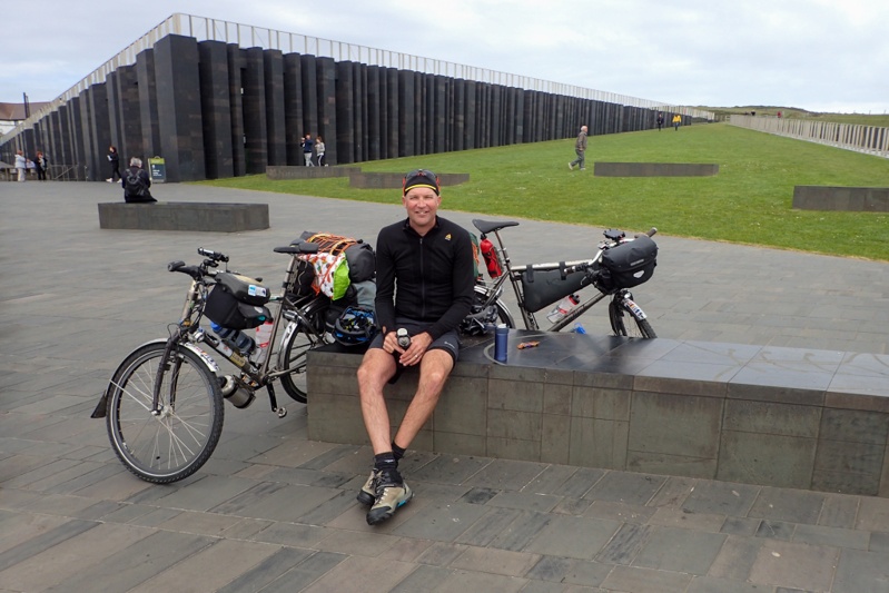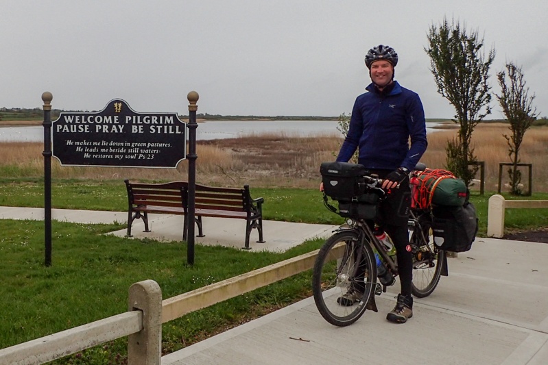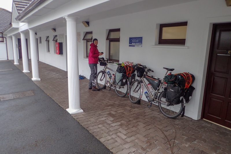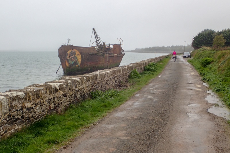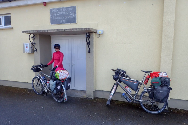 As when we took the Ballyhack Ferry, we had a small overlap today with our route from 4 years ago. We were on the lookout for this and we started to feel the road was familiar. When we were last here it was bitterly cold and wet and we always talk about standing in the dooor overhang of a closed community hall we found to have breakfast with the rain sheeting down. I had an inkling we might see it again, and sure enough we cycled right past it! We could not resist a photo op! We've included it below. A MUCH better weather day today!